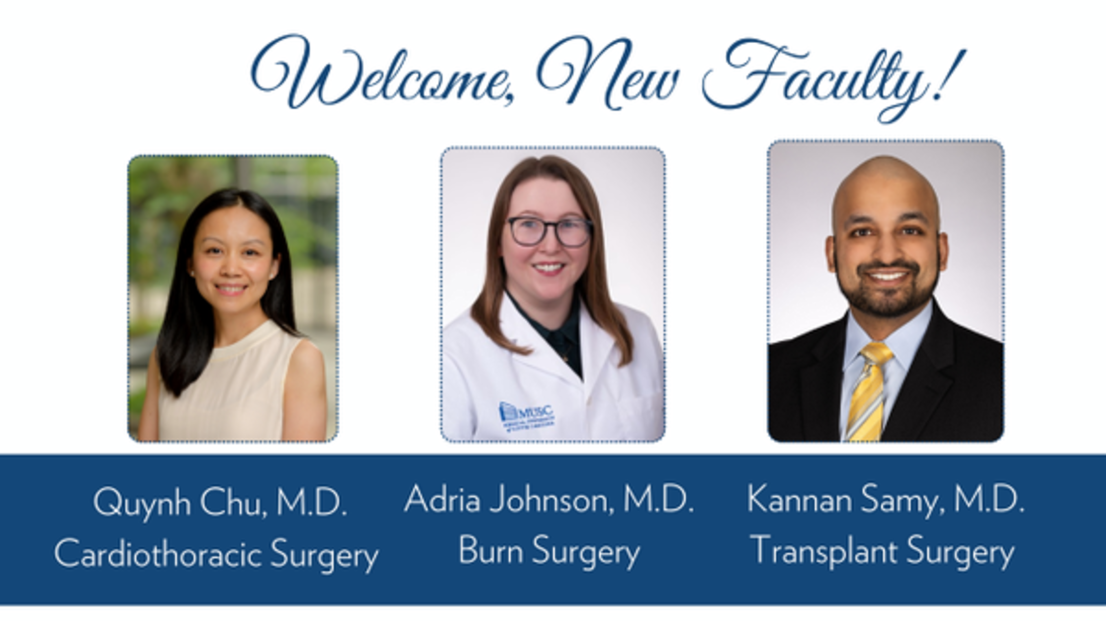 This month, we welcome three new faculty to our Department: Thoracic Surgeon Quynh Chu, M.D., Burn Surgeon Adria Johnson, M.D., and Transplant Surgeon Kannan Samy, M.D. Each joins us exceeding well-trained in their area of surgical expertise. Each joins us exceeding well-trained in their area of surgical expertise.