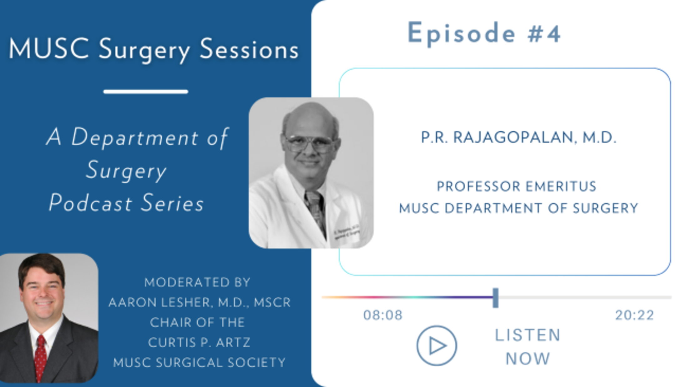 MUSC Surgery Sessions Podcast Series is our latest endeavor to celebrate and recognize our esteemed faculty whose expertise and innovative spirit helped shape the MUSC Department of Surgery and their respective fields. Please join us in our efforts to capture our rich history through the voices of some of the giants in the field by listening to the fourth episode with a leader in transplant surgery, P.R. Rajagopalan, M.D., Professor Emeritus