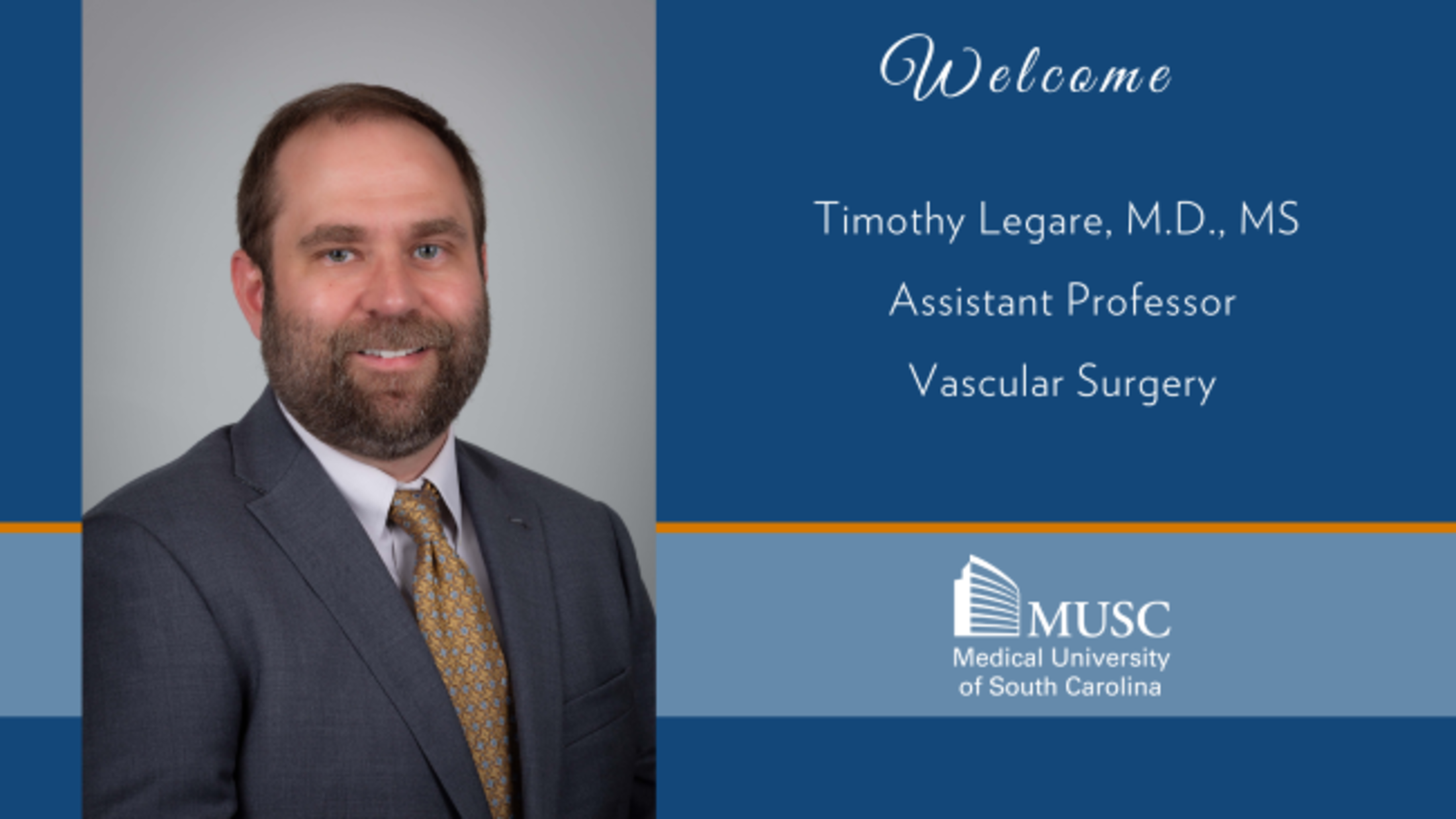 The MUSC Department of Surgery is excited to announce Timothy Legare, MD, MS, RPVI, joins the Division of Vascular Surgery as an Assistant Professor, effective August 18. Dr. Legare is a fellowship-trained vascular surgeon who specializes in the treatment of peripheral arterial disease, limb preservation, dialysis access surgery, aortic and arterial aneurysms, carotid disease and venous disease, using the latest open and minimally invasive endovascular techniques.