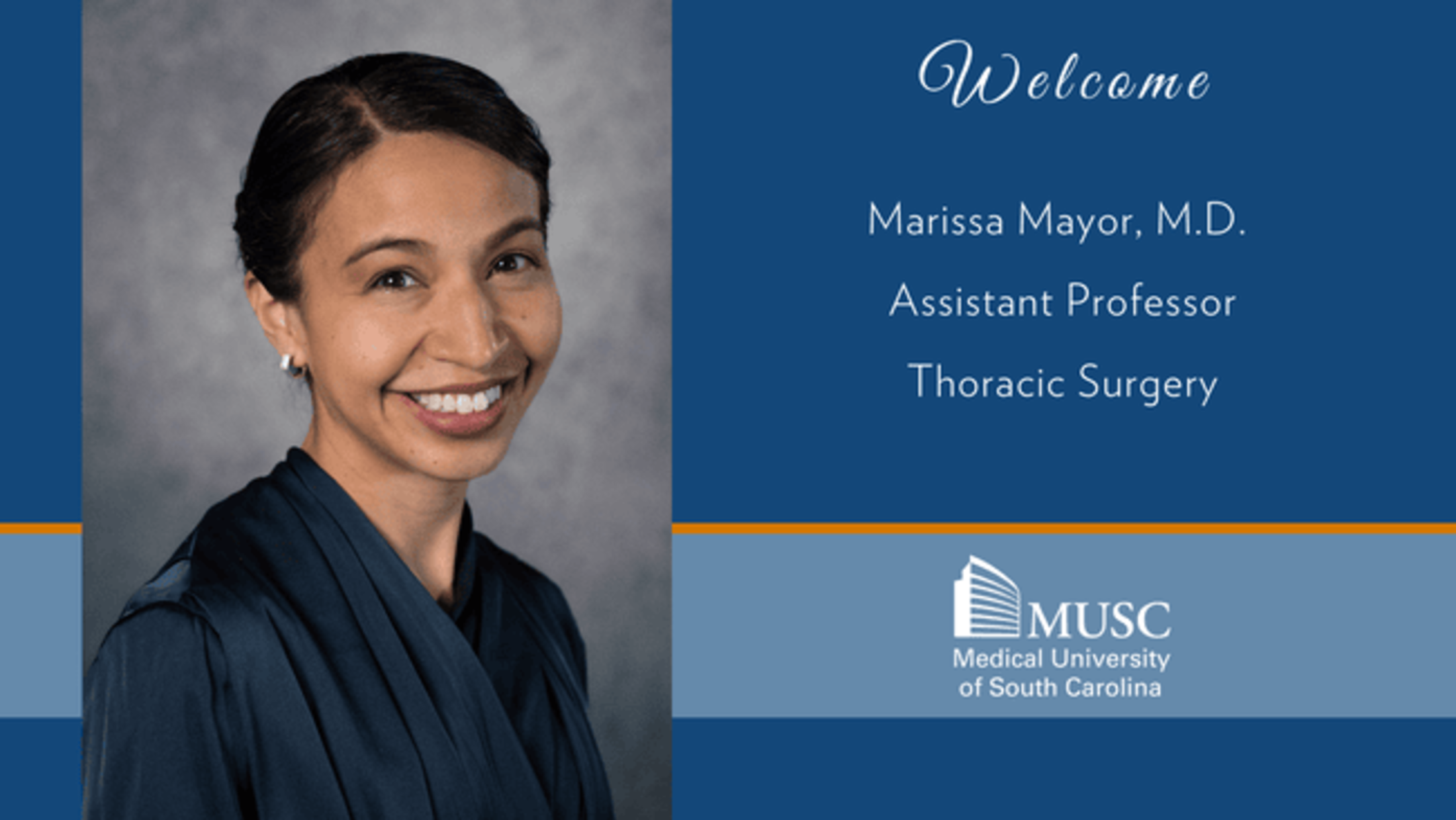 The MUSC Department of Surgery is excited to welcome Marissa Mayor, M.D., to the Division of Cardiothoracic Surgery. Dr. Mayor will join us on September 1, 2025. She is a board-certified general surgeon and a fellowship-trained thoracic surgeon who specializes in disorders of the lung, esophagus, chest wall, stomach, and mediastinum.