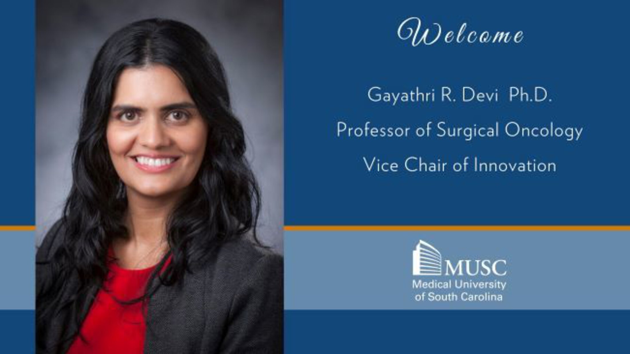 The MUSC Department of Surgery is pleased to announce that Gayathri Devi, Ph.D., M.S., joins MUSC in a dual role as Professor of Surgical Oncology and Vice Chair of Innovation in the Department of Surgery, and as Director for Scientific Program Integration at Hollings Cancer Center, effective October 1, 2025.