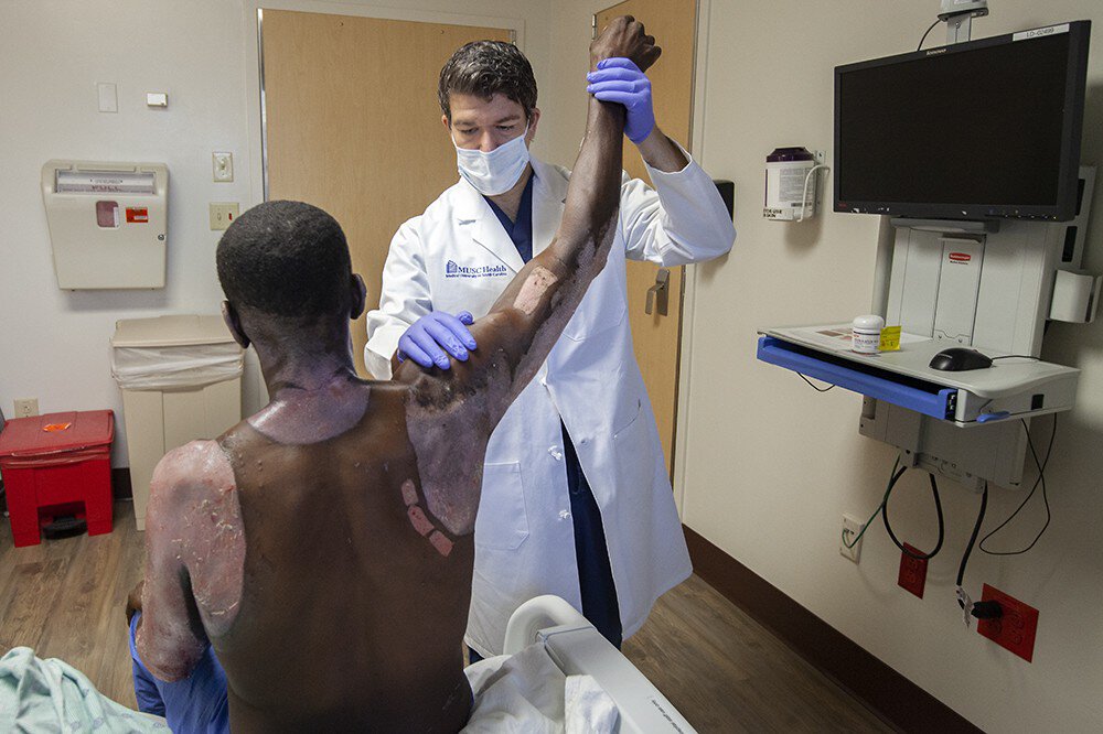 A Dorchester County man is home a week earlier than might typically be expected after an MUSC Health team performed the first reported successful minimally invasive skin graft on a burn in the U.S.